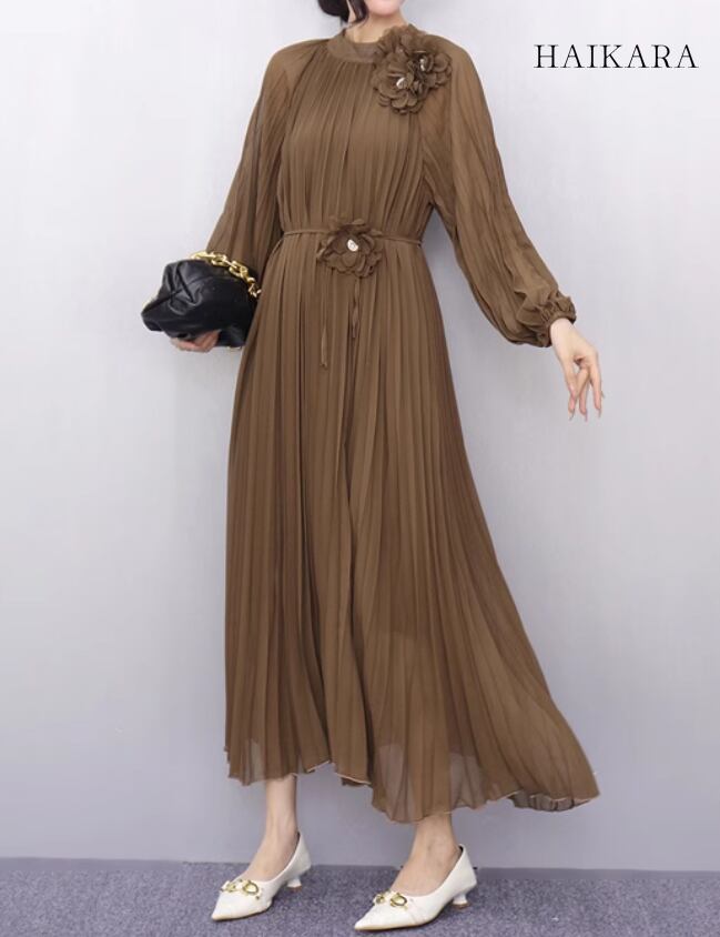 ★【 コサージュがアクセントになった上品なスタイル、エレガントな雰囲気のロング丈クラシカルワンピース 】