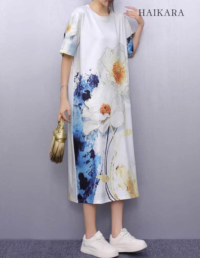 ★【 花柄が目を引く明るいデザイン、ゆったりと着られるTシャツ風ワンピース 】