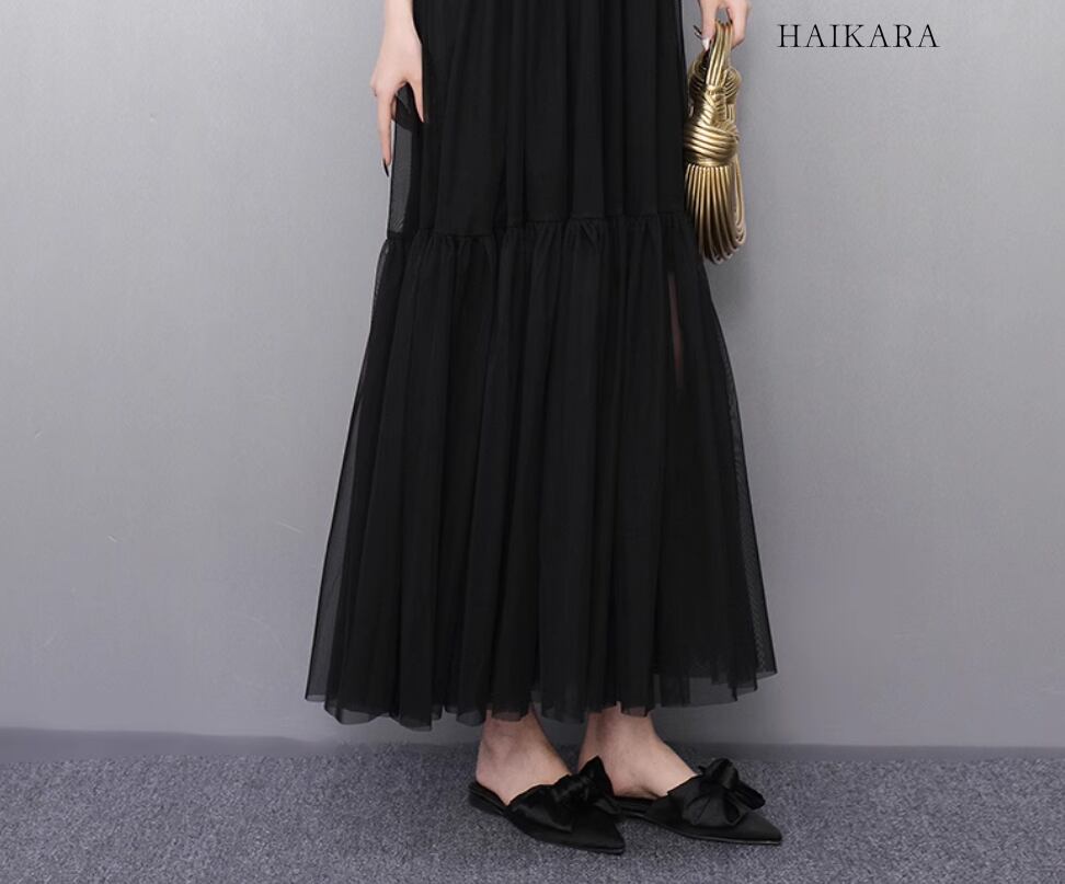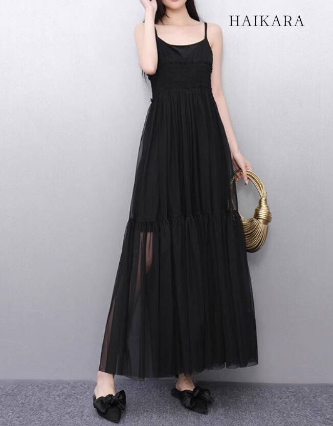 ★【 裾に切り替え加工を入れた華やかな見た目、エレガントなキャミソール式ワンピース 】