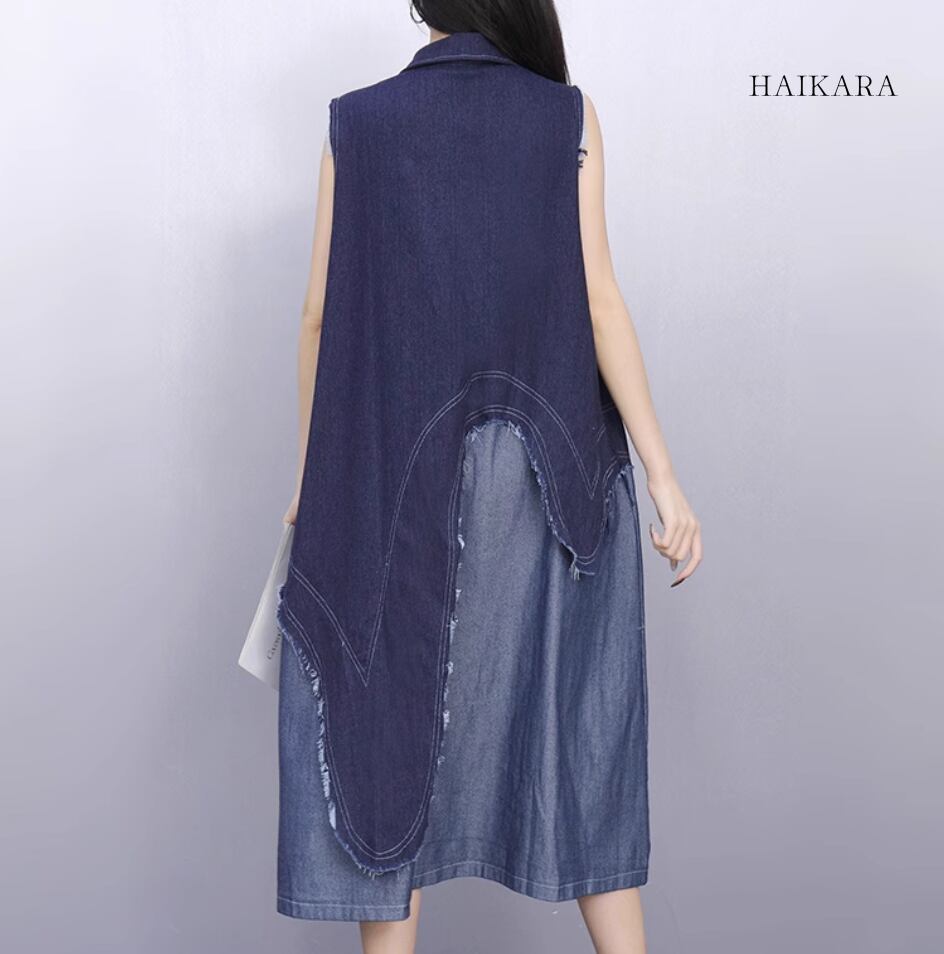This is a casual style sleeveless dress in a combination of denim and different fabrics.