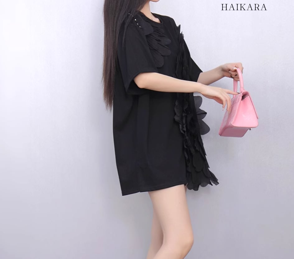 ★【 立体的なお花を取り入れたデザインが魅力、様々な服と合わせやすいTシャツ 】
