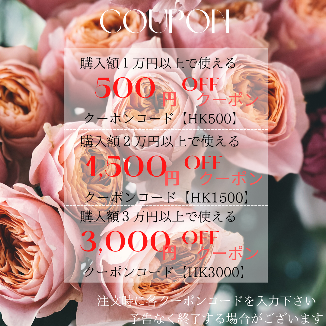- 購入額2万円以上で1,500円OFF クーポンコード【HK1500】 購入額3万円以上で3,000円OFF クーポンコード【HK3000】