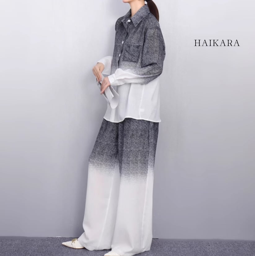 ★【 美しいグラデーションが目を引く、シャツとワイドレッグパンツのセットアップです。