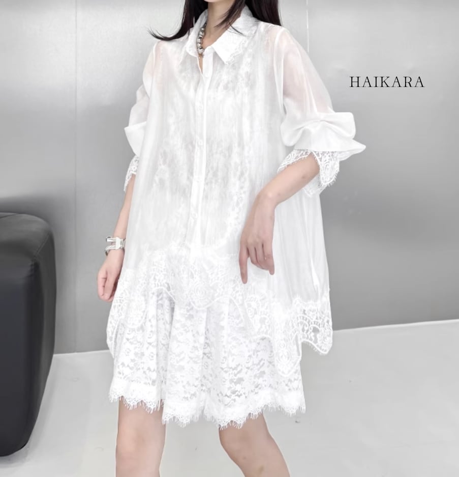 単色のボディに白いレースが映え、クラシカルながらもモードな雰囲気を演出します。