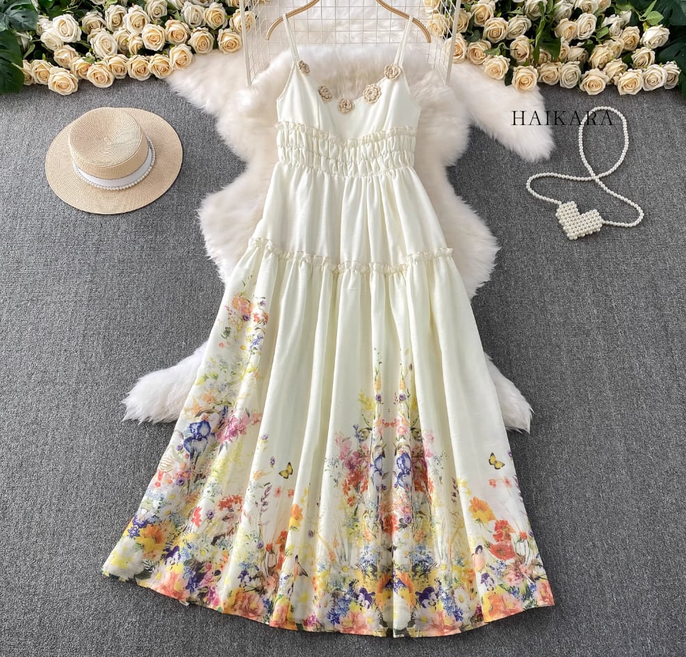 ★【 アイボリーカラーの生地に、裾にかけてカラフルな花柄と蝶々がプリントされたティアードデザインのキャミソールワンピースです。