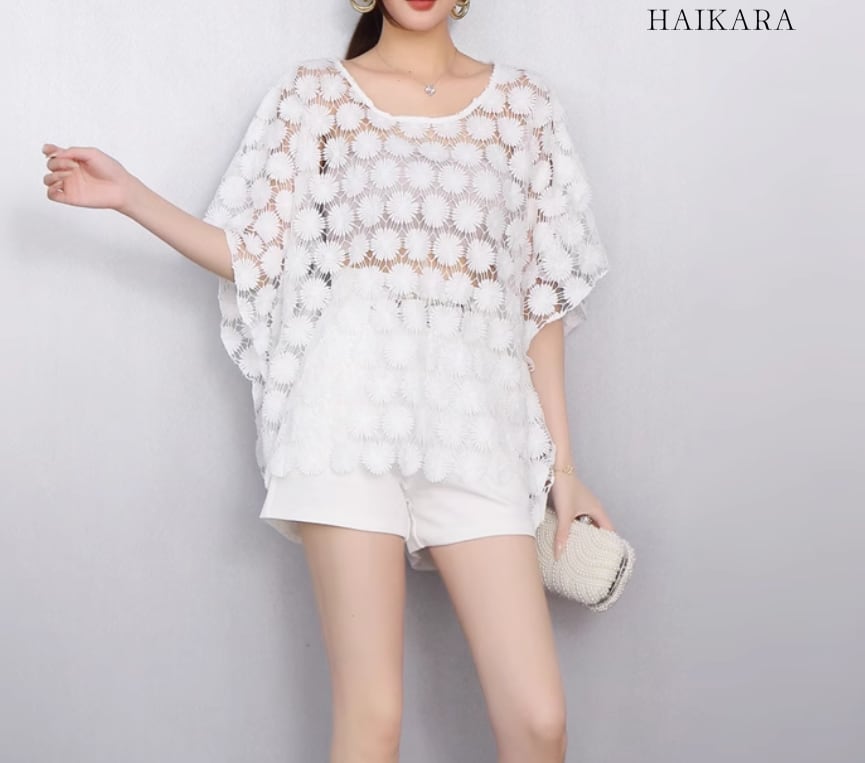 ★【 全体に花のカットワークが施された、透け感のあるトップスです。