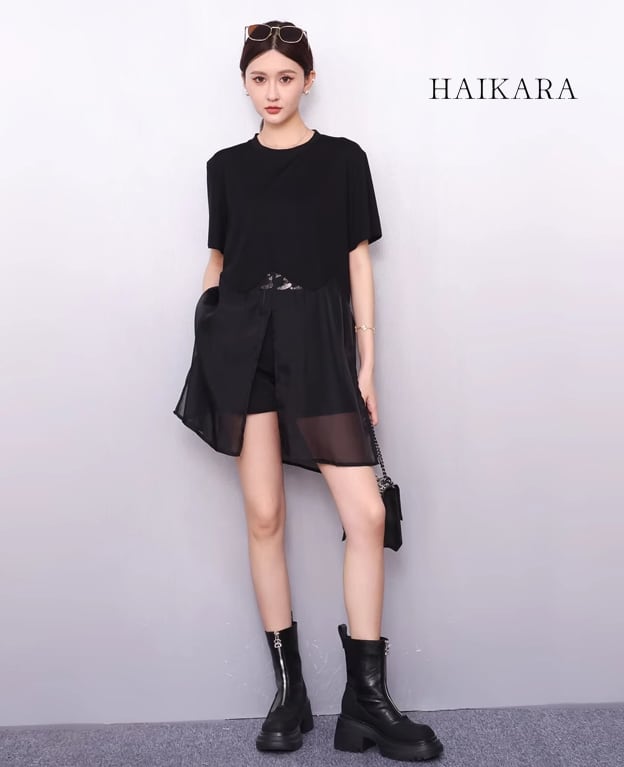 ★【 厚手生地の上部と、透け感のあるシアー素材のレイヤードデザインが特徴のチュニック丈トップスです。
