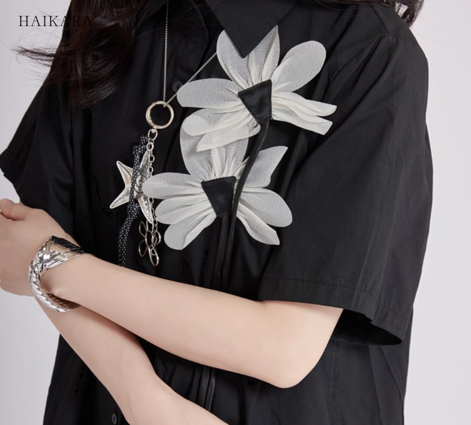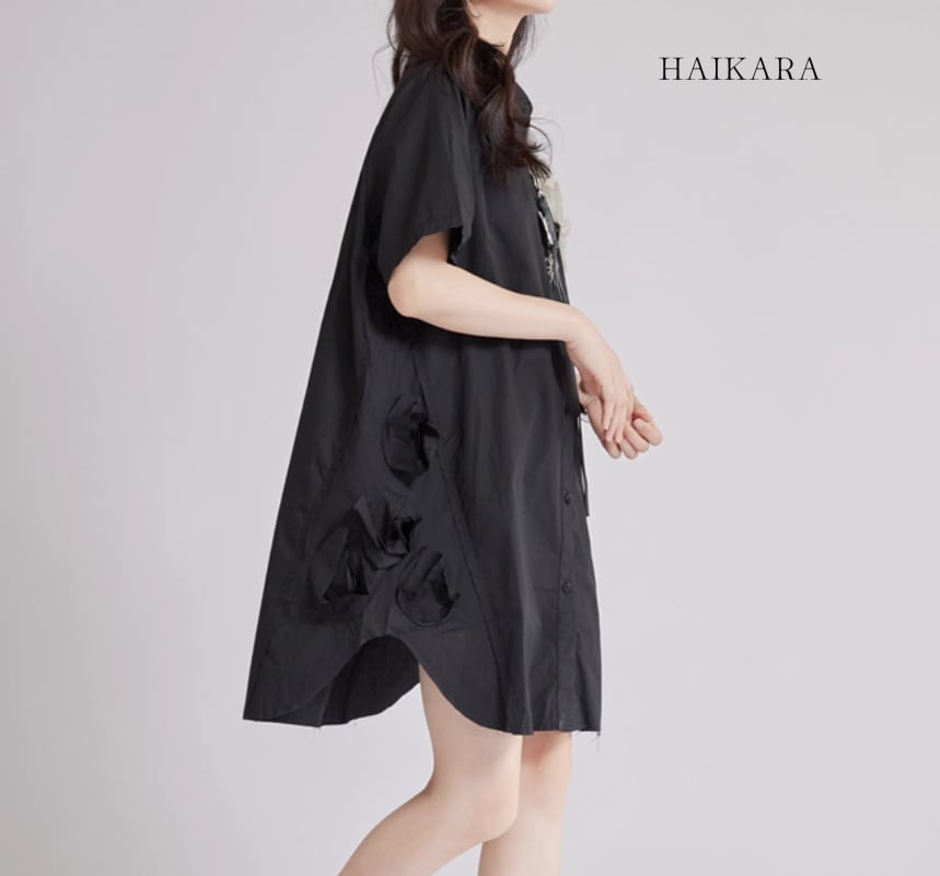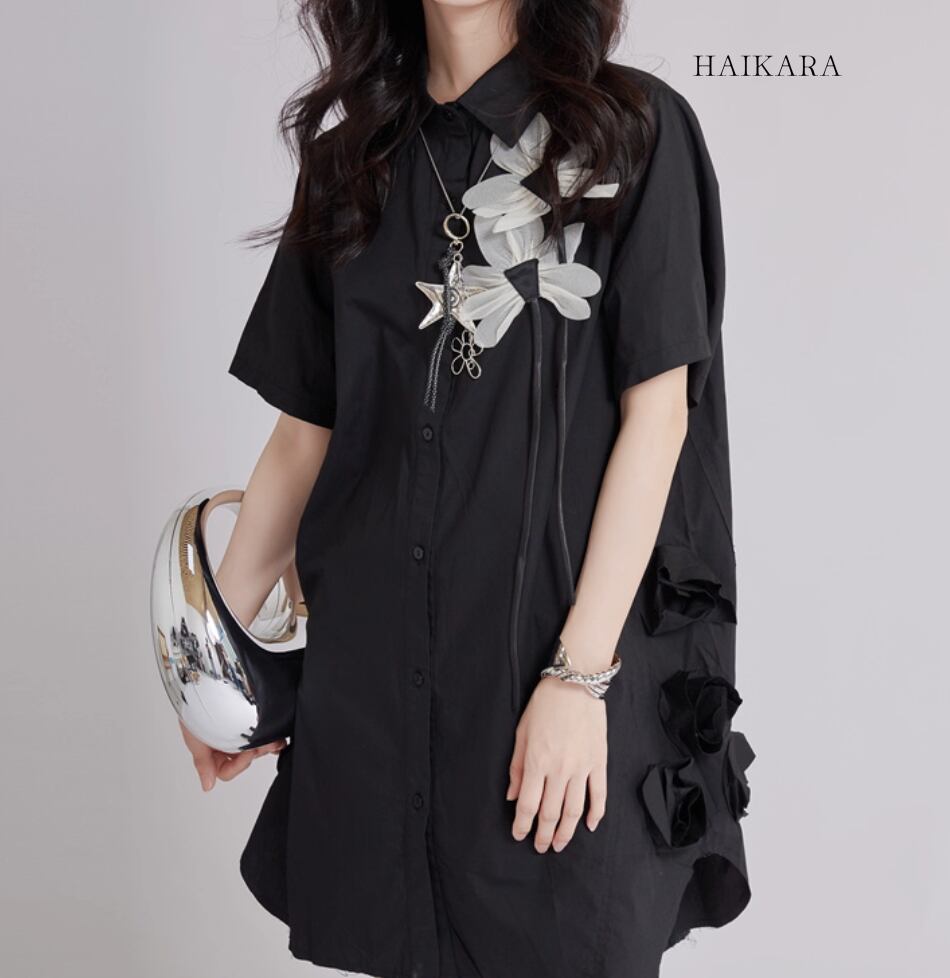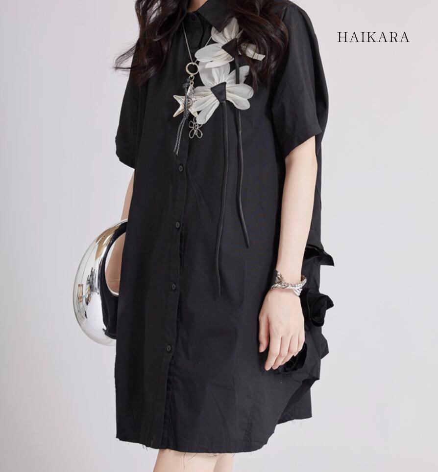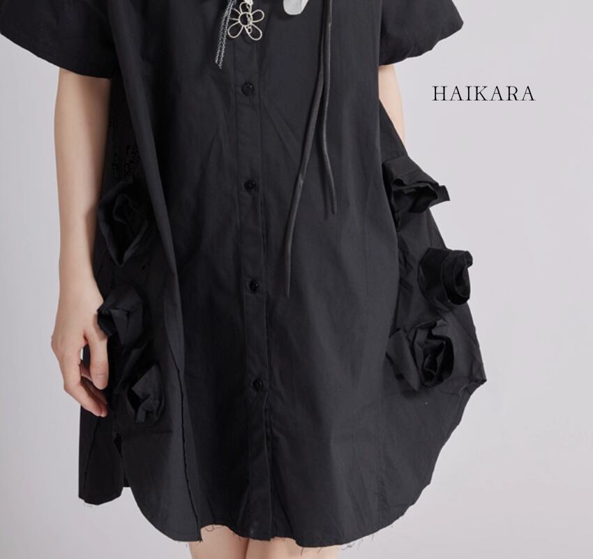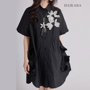 ★【 襟元とサイドに立体的な花飾りが施された、個性的なデザインのシャツです。 ゆったりとしたAラインシルエットで、一枚でさらっと着こなすことができます。 モードな雰囲気で、カジュアルなパンツやレギンスと合わせたスタイルがおすすめです。 】