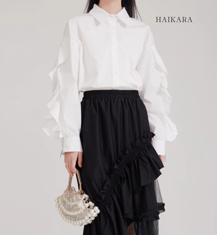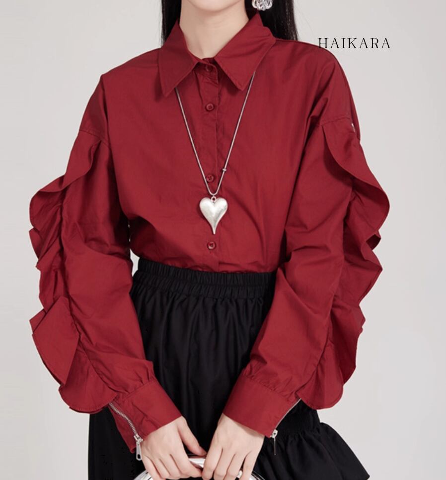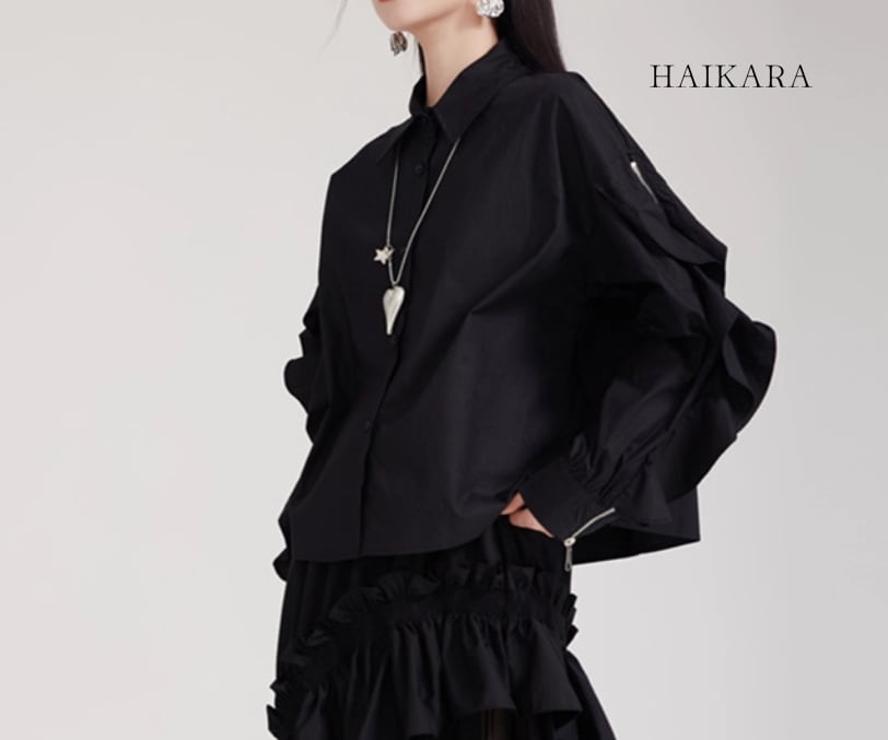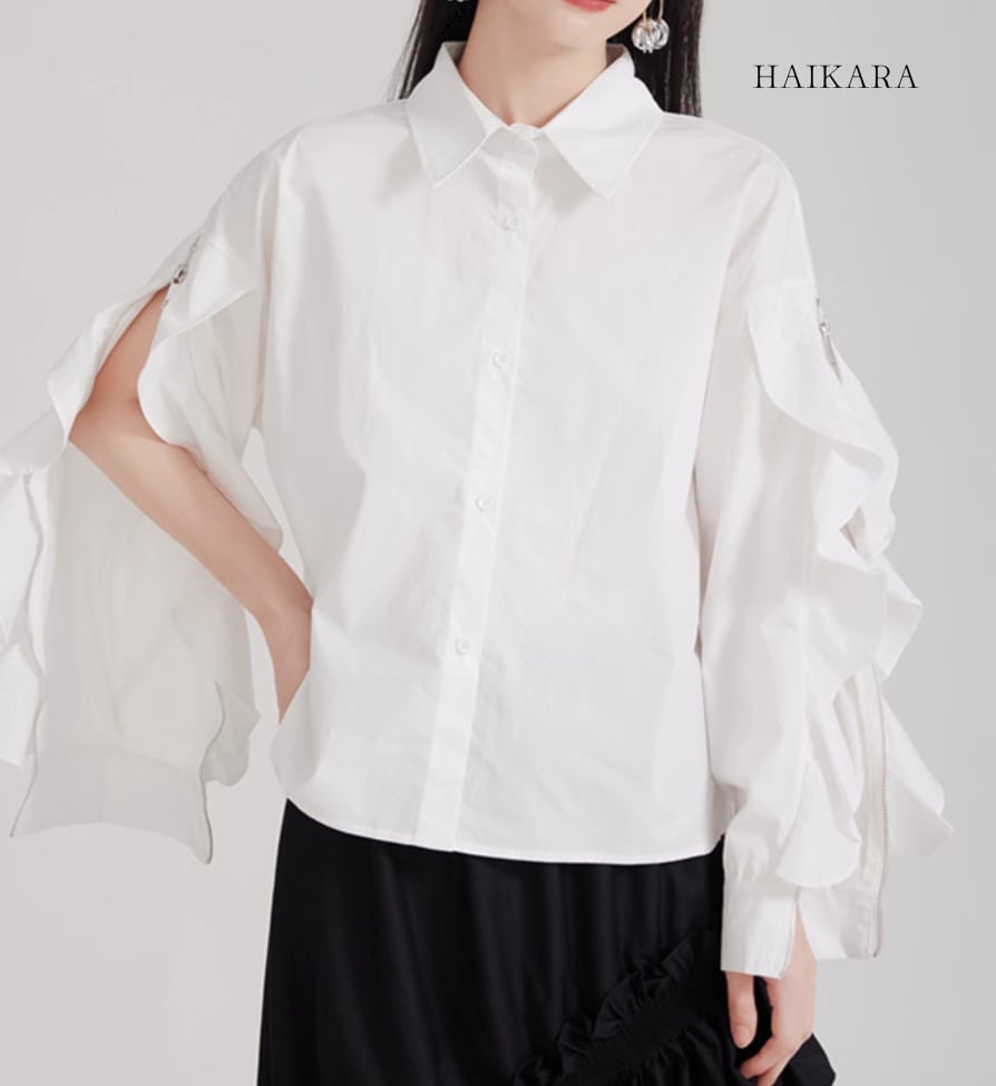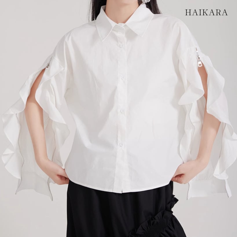 ★【 袖のフリルとジッパーのデザインが特徴的なブラウスです。