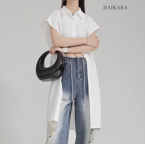★【 アシンメトリーな裾のデザインが特徴的なシャツワンピースです。