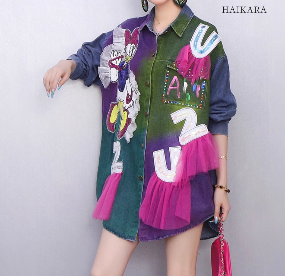 ★【 イラストとチュール素材の装飾が施されたデニムシャツです。