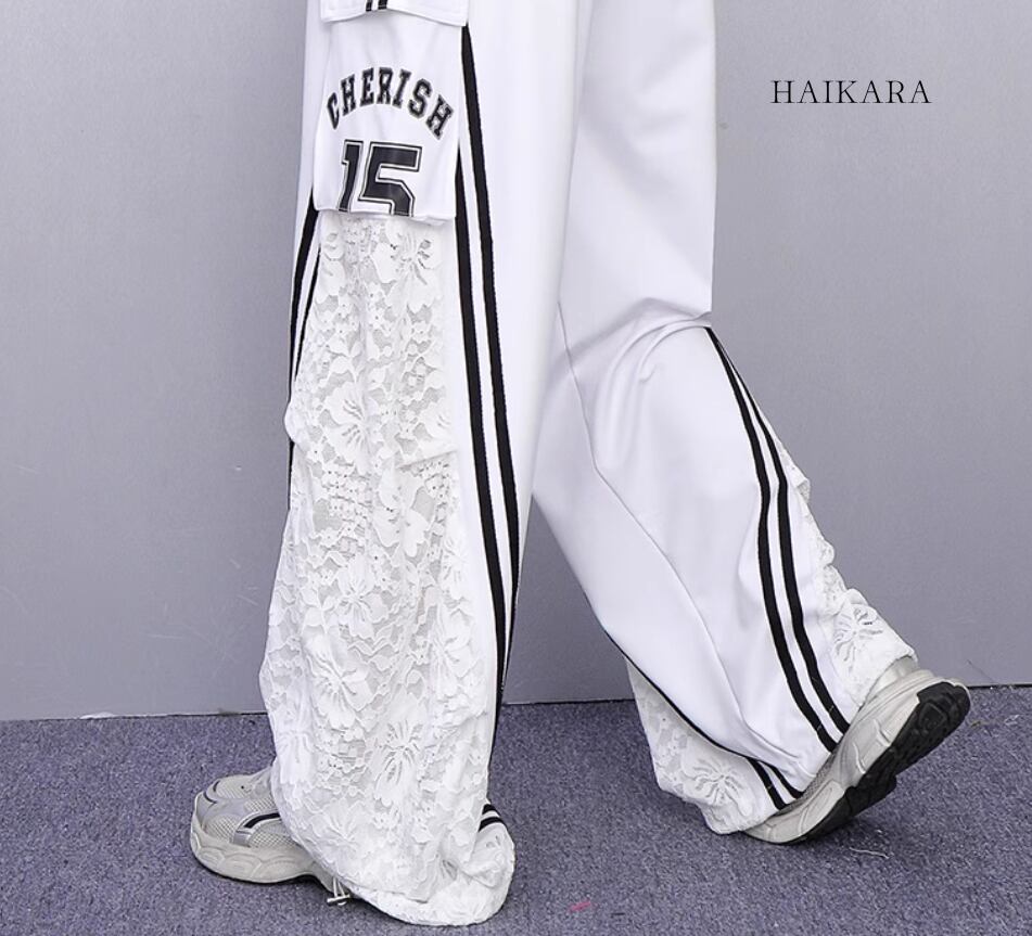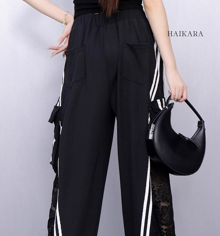 ★【 サイドのライン、裾のレース生地、そしてウエスト部分のデニムの切り替えが特徴的なワイドパンツです。