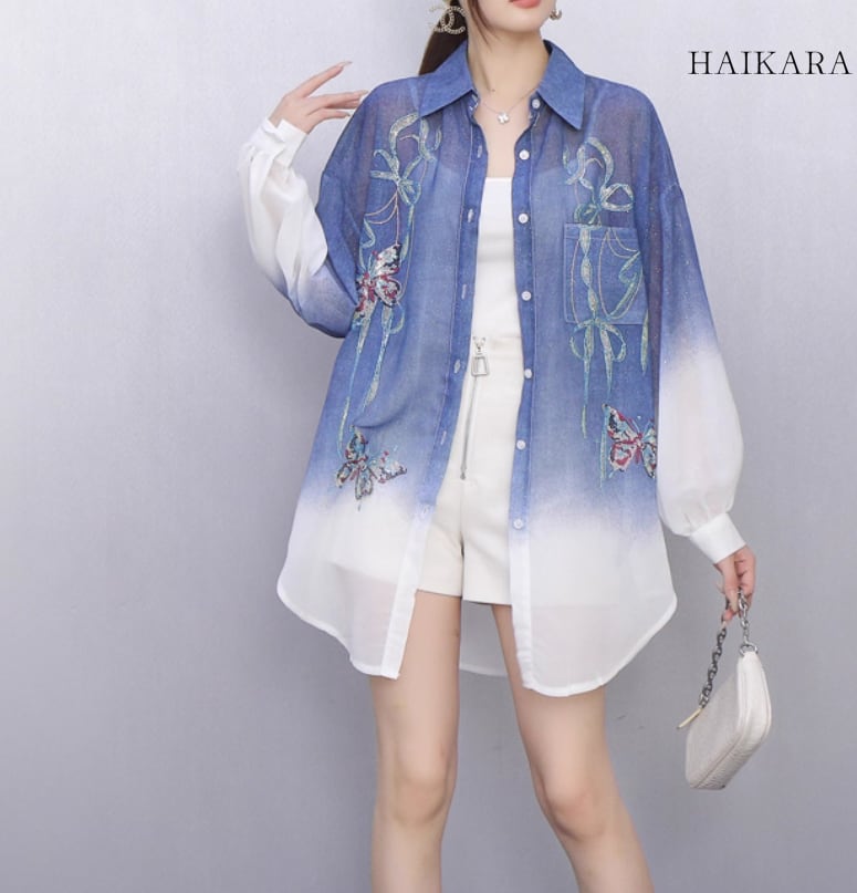 ★【 グラデーションデザインと刺繍が施されたシアーシャツです。
