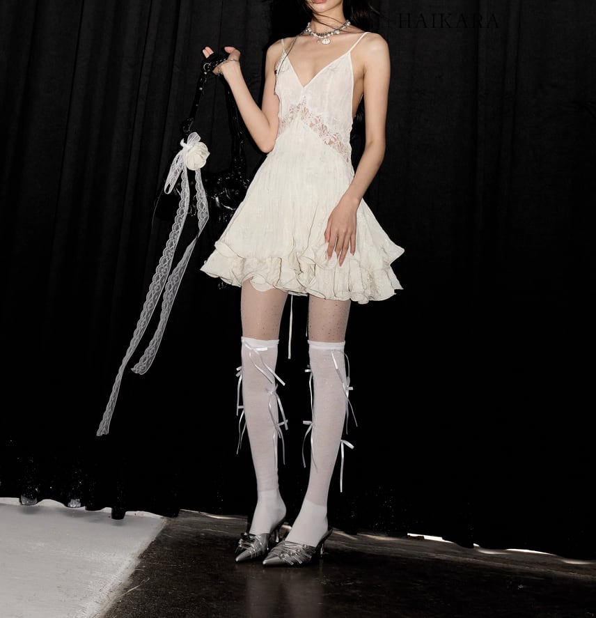 Vネックと細いストラップがデコルテを美しく見せ、軽やかな印象を与えます。