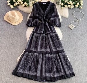 ★【 Vネックの胸元とティアードデザインに、幾何学模様のプリントが施されたワンピースです。