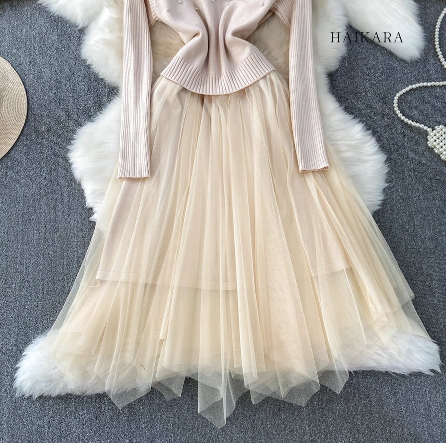 セットで着用することで、ガーリーなレイヤードスタイルが完成します。