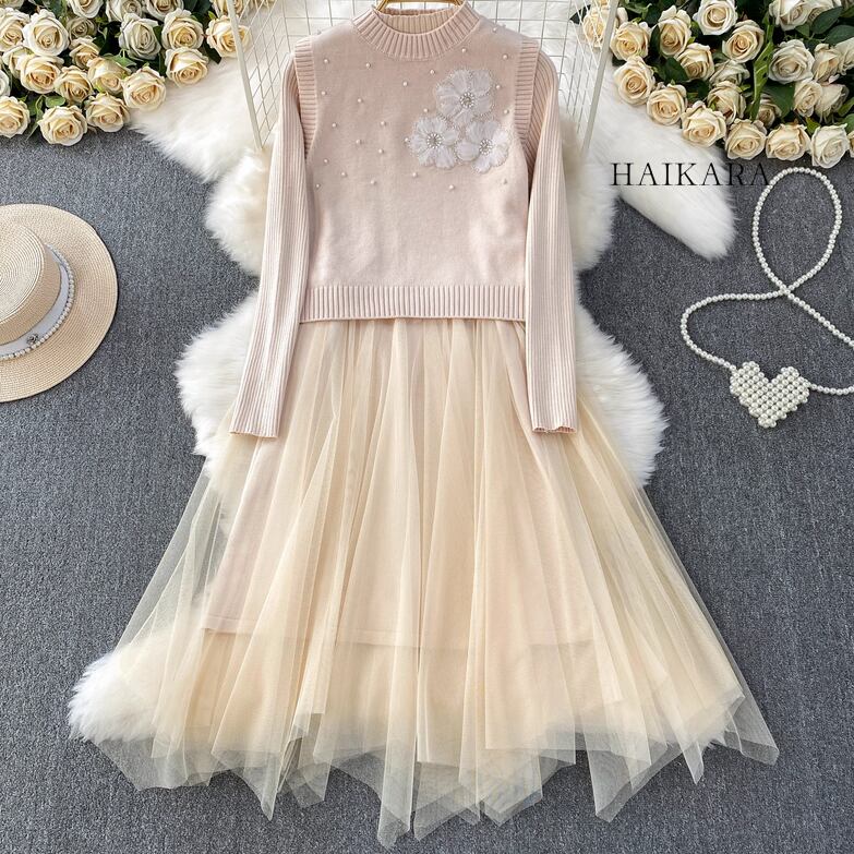 ★【 レースのモチーフとパール調の装飾がポイントのニットベストと、プリーツ加工が施されたワンピースのセットです。