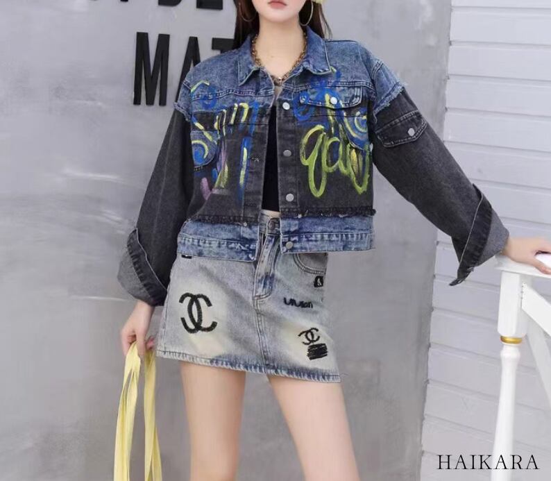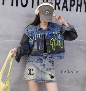 ★【 グラフィティ風のペイントデザインが目を引く、ストリート感あふれるデニムジャケットです。