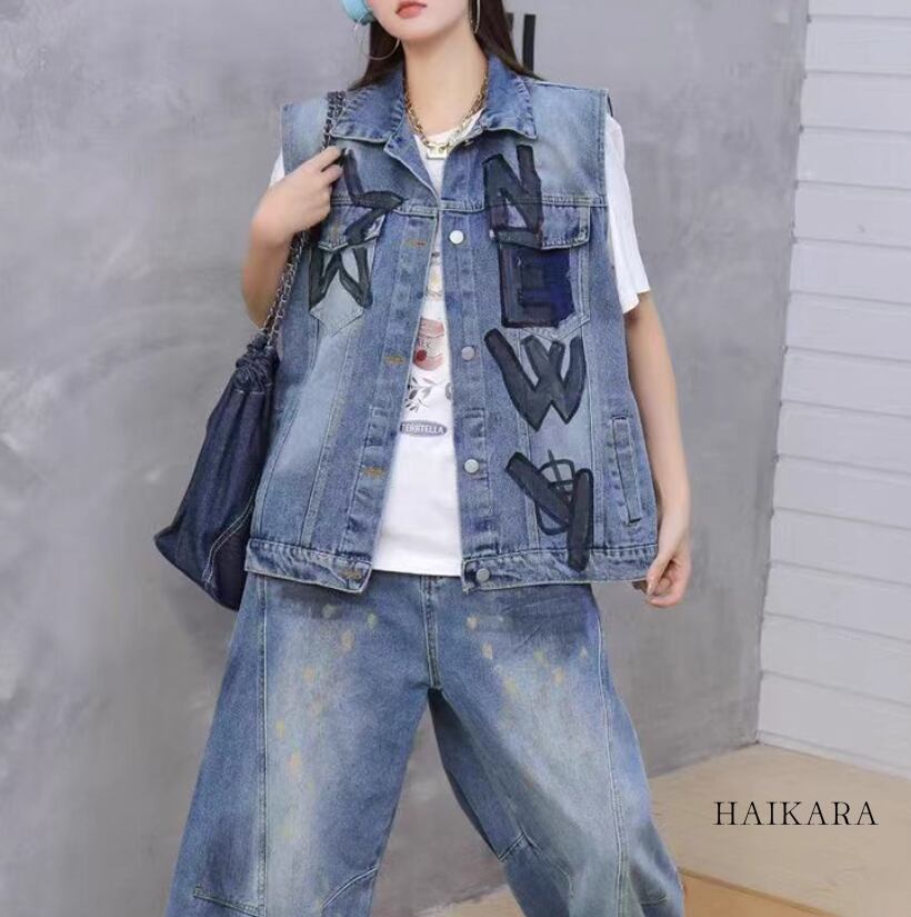 ★【 グラフィティ風のペイントデザインが目を引く、個性的なデニムベストです。