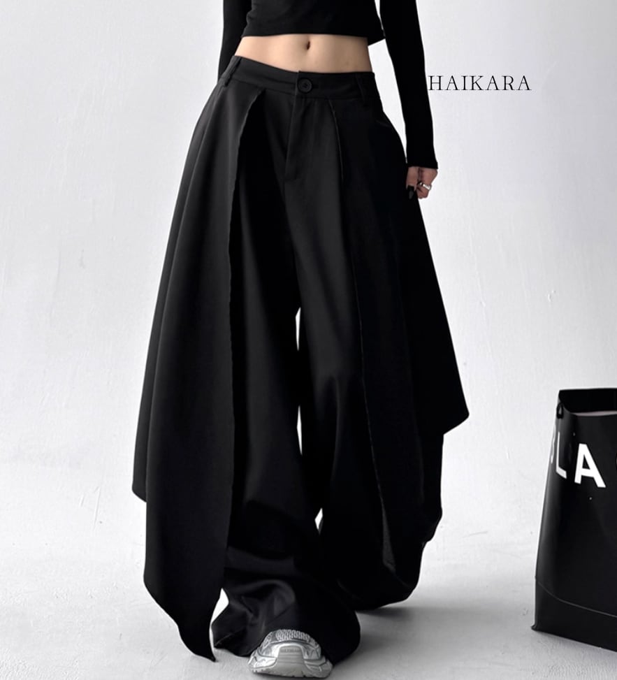 ★【 両サイドにスカートのような生地が重ねられたデザインが特徴的なワイドパンツです。