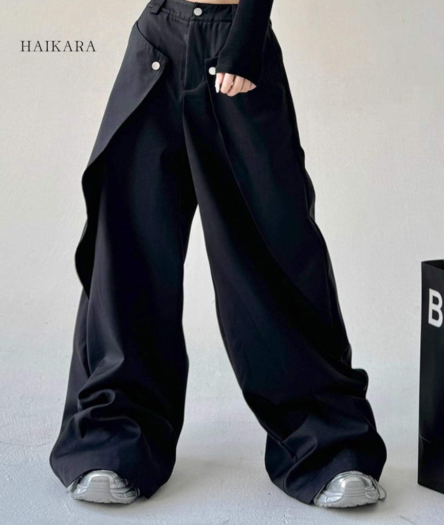 ★【 スカートのようなデザインのレイヤードと、フロントのボタンがポイントになったワイドパンツです。