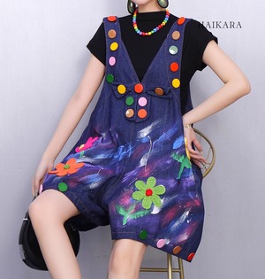 ★【 カラフルなフラワーモチーフとペイントが施されたデニム地のサロペットです。