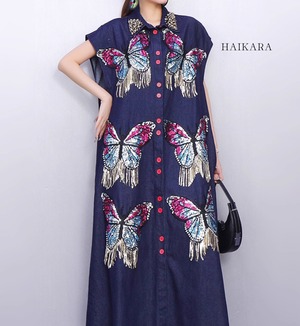 ★【 ビーズとフリンジで蝶のデザインが施された、ノースリーブのシャツワンピースです。