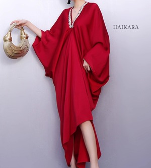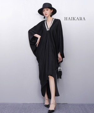★【 ネックラインのビジュー装飾とアシンメトリーな裾のデザインが特徴的な、ワンピースです。