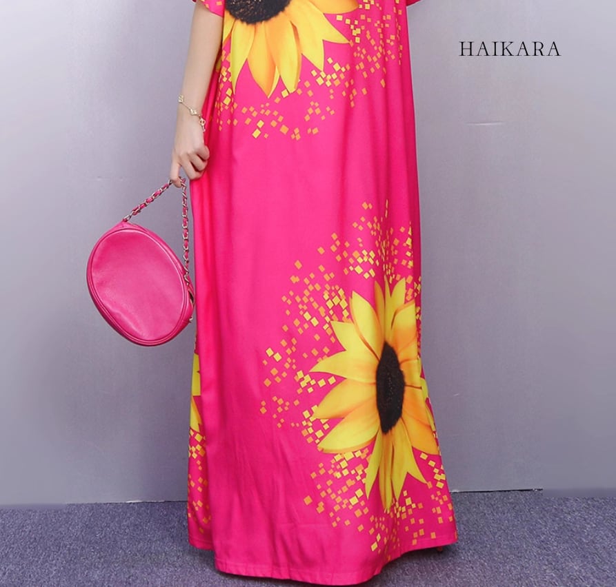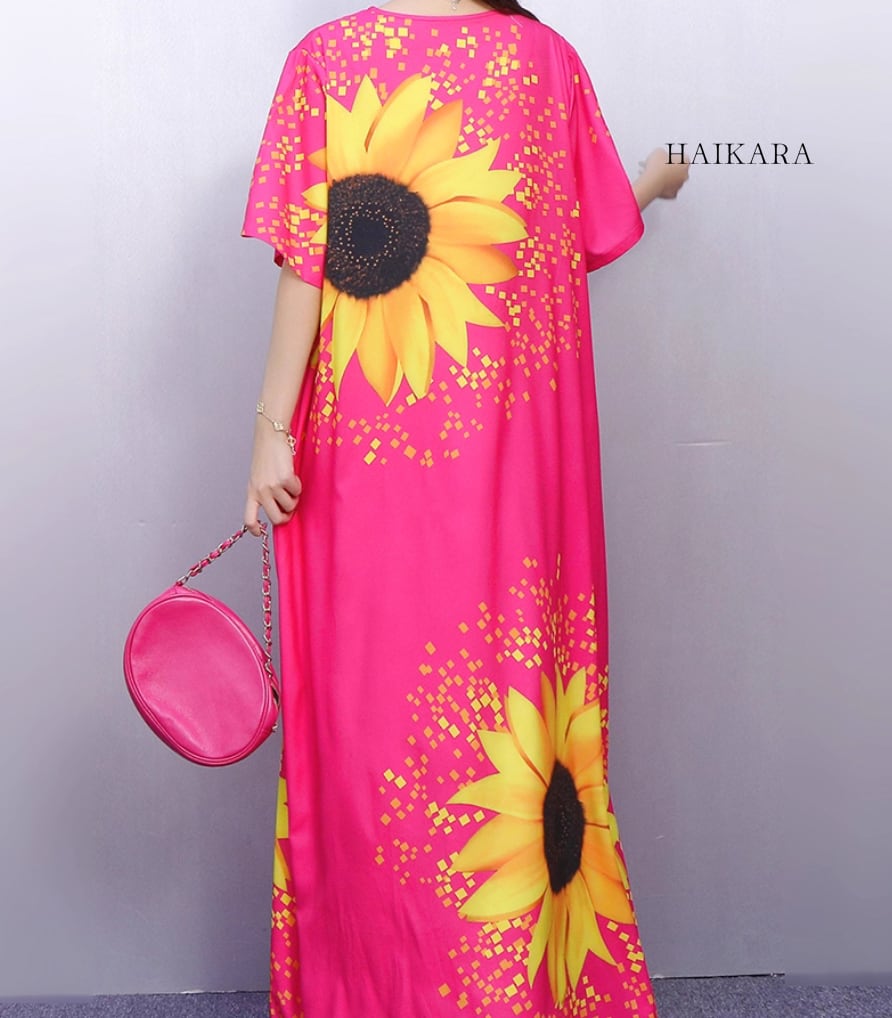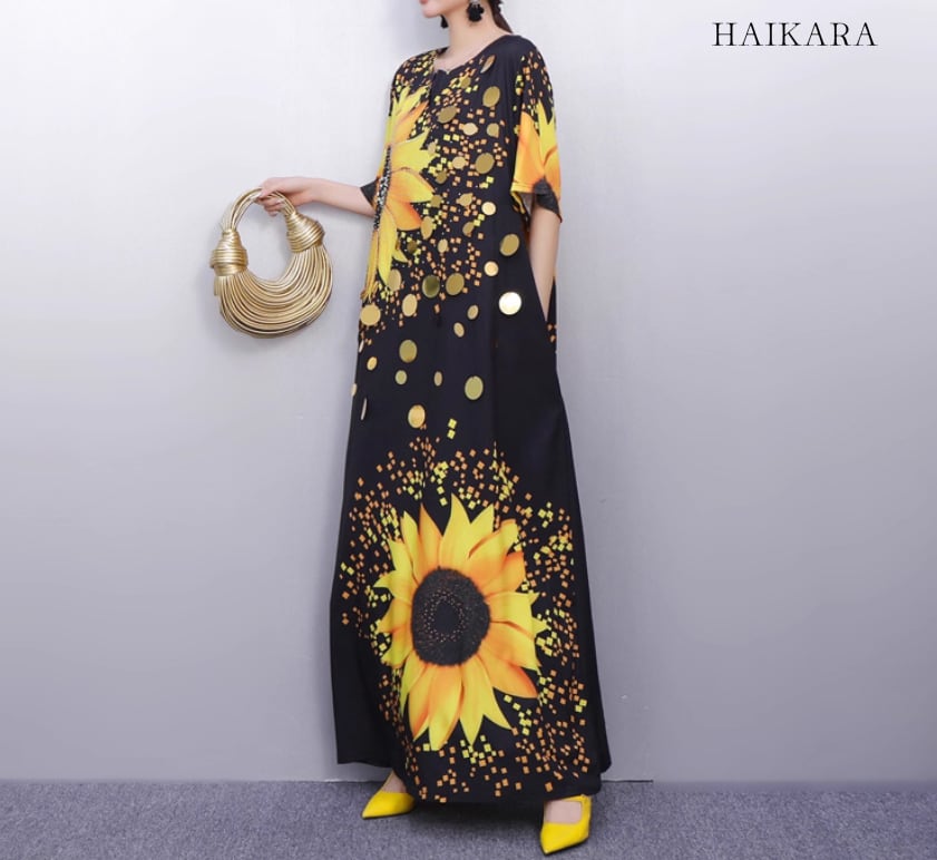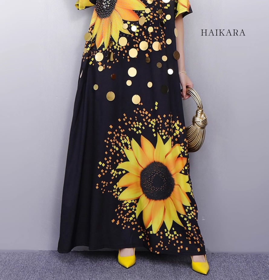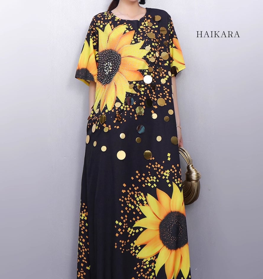 ★【 大きなひまわりの柄と、ドット柄のビーズの装飾がポイントのワンピースです。