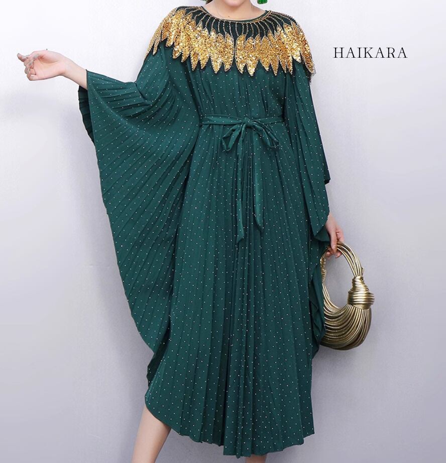 ★【 首元のきらびやかなビジューと、ドレープ感のある袖のデザインが華やかなワンピースです。