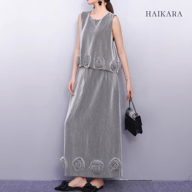 ★【 凹凸のあるストライプ柄にバラのような立体的な装飾があしらわれた、セットアップです。