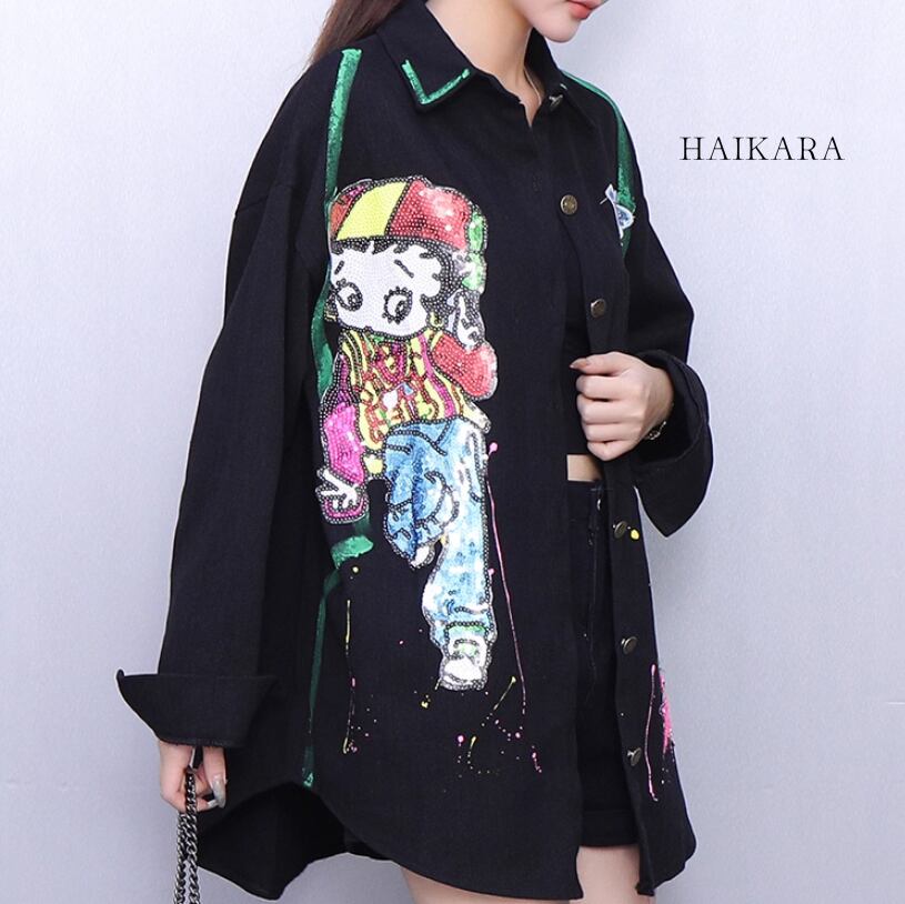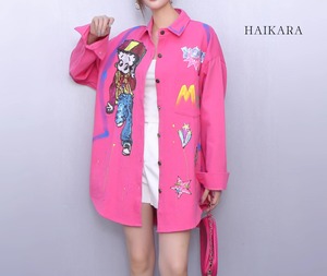 ★【 イラストと、カラフルな模様が施されたカジュアルシャツです。