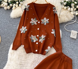 ★【 花のコサージュがアクセントになった、優しい印象のカーディガンとニットパンツのセットアップです。