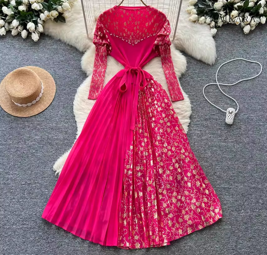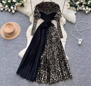 胸元にビーズ風のストーンをあしらった、華やかで上品な切り替えデザインのロングワンピースです。