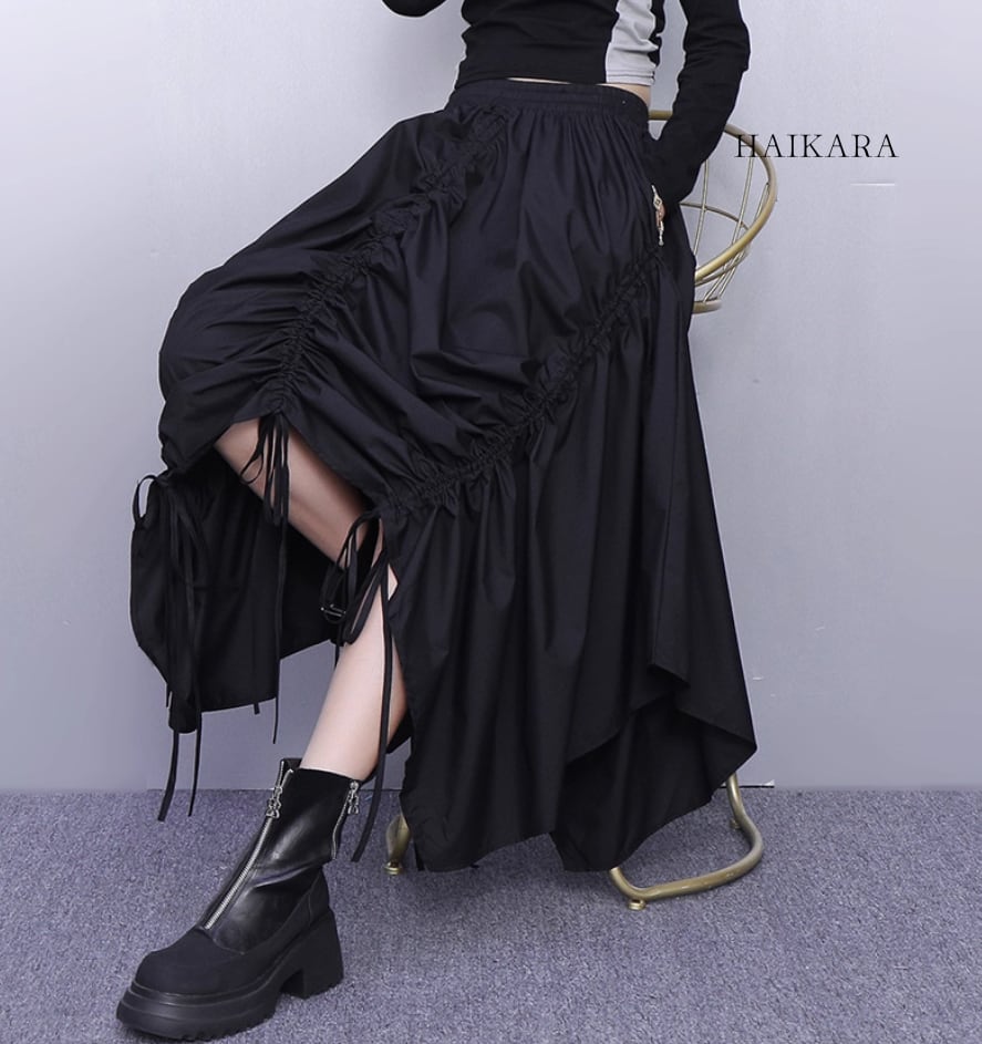★【 アシンメトリーなシルエットと、斜めに走るギャザーが印象的なスカートです。