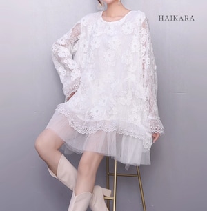 ★【 花柄レース風の生地に、チュールを重ねたロマンティックなトップスです。