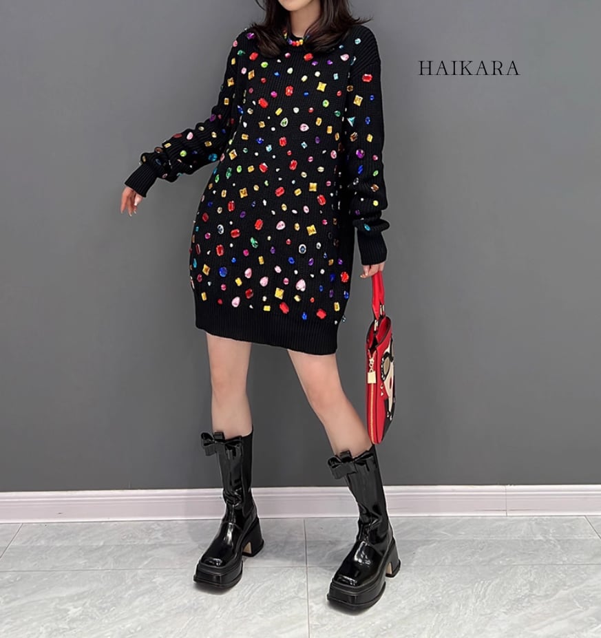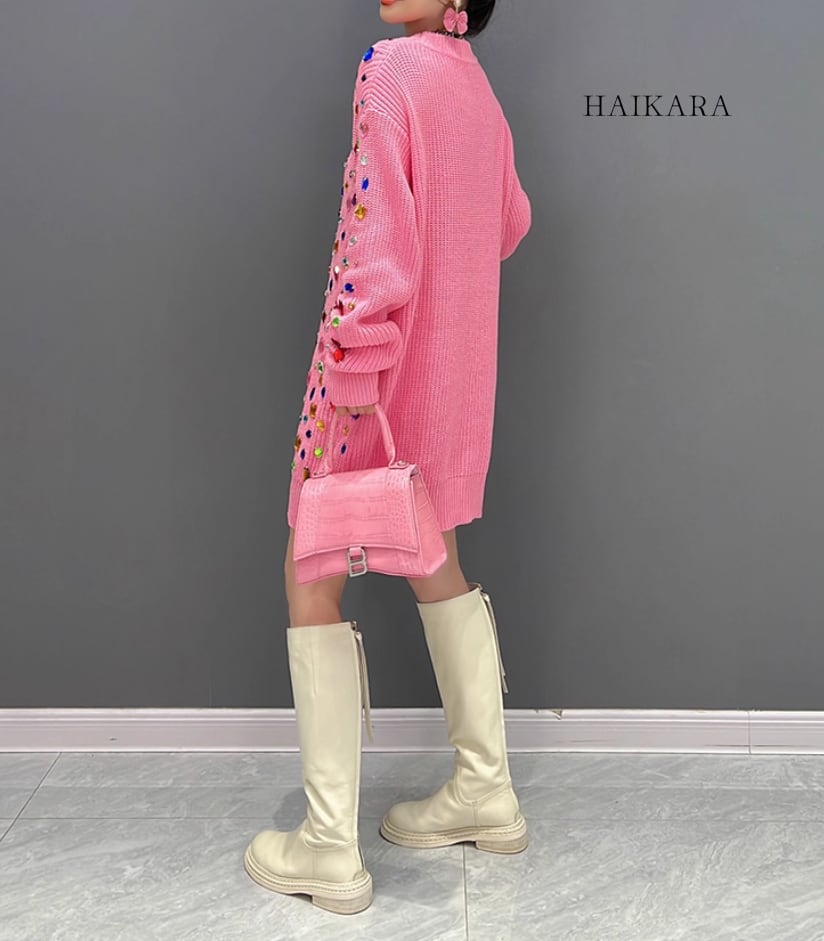 ★【 鮮やかなカラーに、ストーンを散りばめた華やかなセーターワンピース。