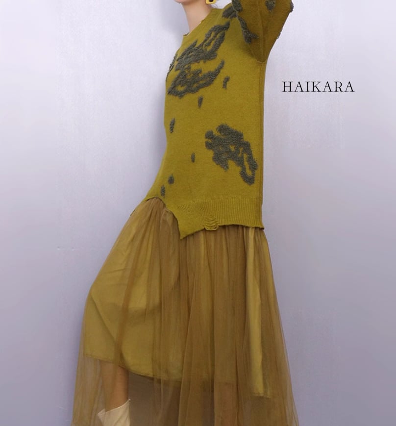 ゆったりとしたニット風の上身頃に、透け感のあるチュールスカートが重なり、奥行きのあるシルエットを演出。