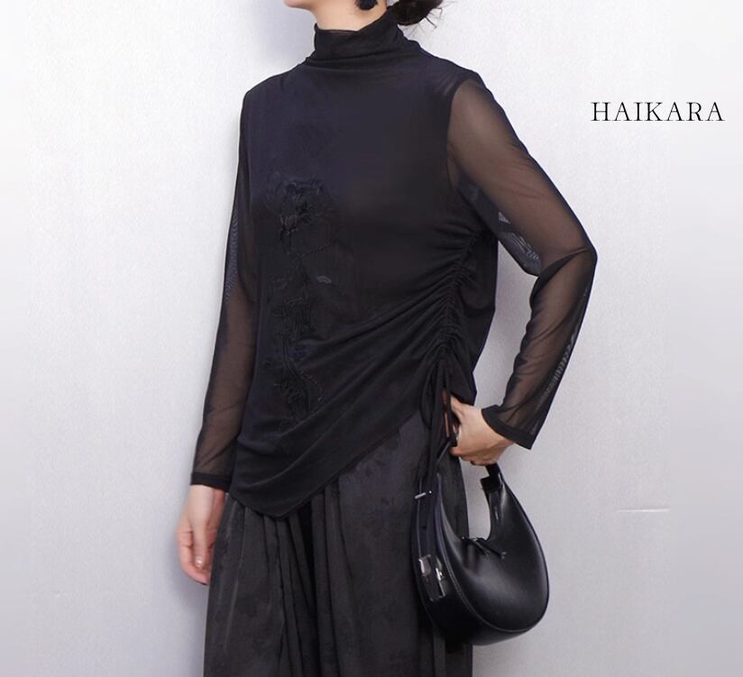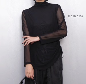 ★【 シアーなメッシュ生地の袖がセクシーな印象の、ハイネックトップスです。