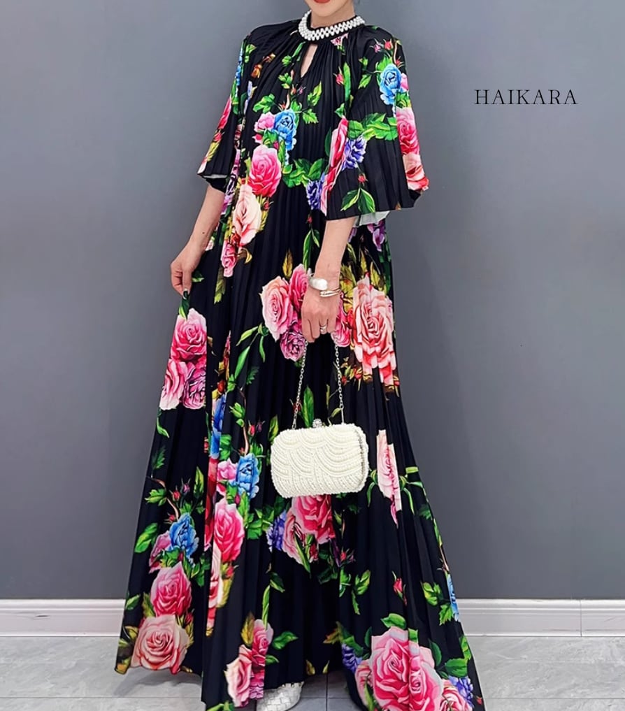 ★【 華やかなローズ柄が全体にプリントされた、プリーツ加工のロングワンピースです。