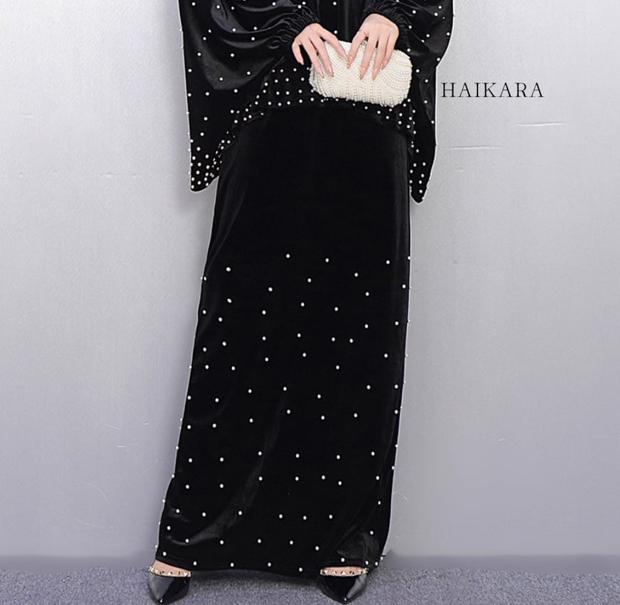 トップスはドルマンスリーブのルーズなシルエットで、スカートはロング丈のストレートなラインが特徴です。