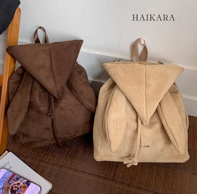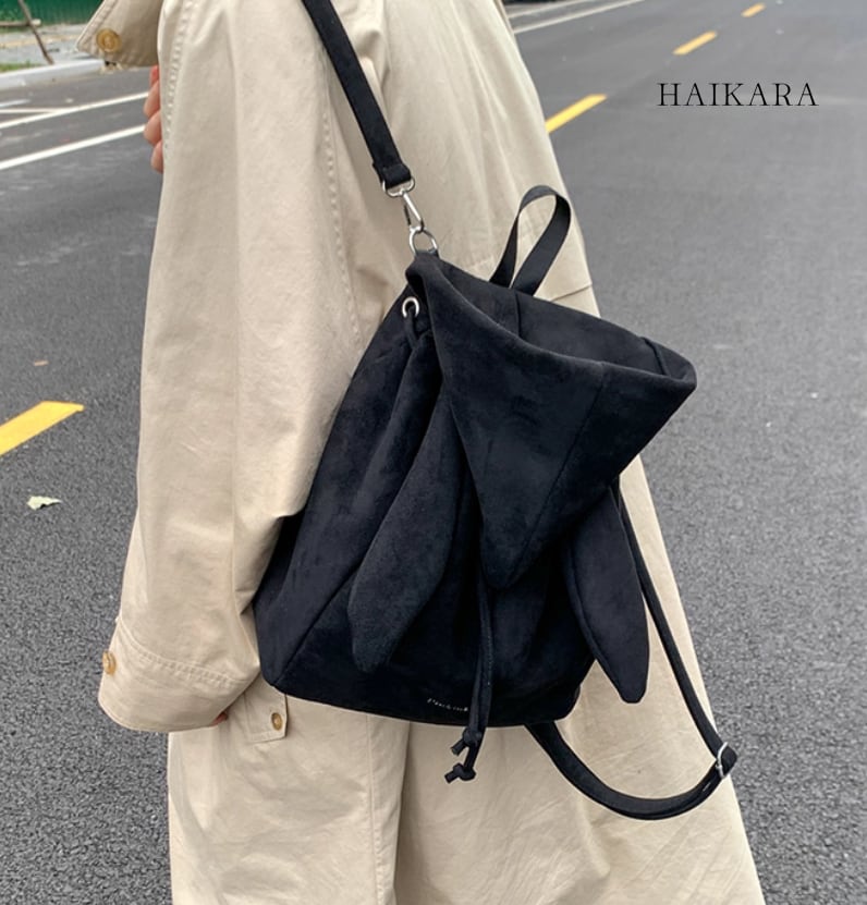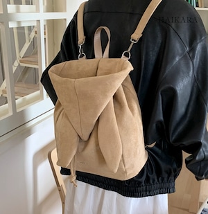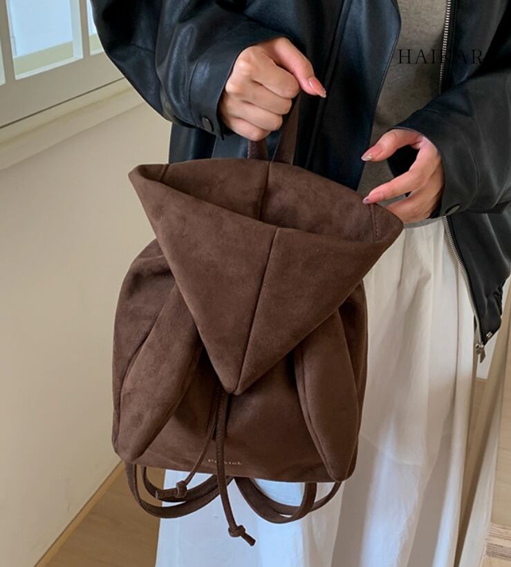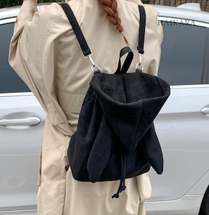 ★【 スエード調のPU素材を使用した、三角のフラップが特徴的な巾着型のミニリュックです。