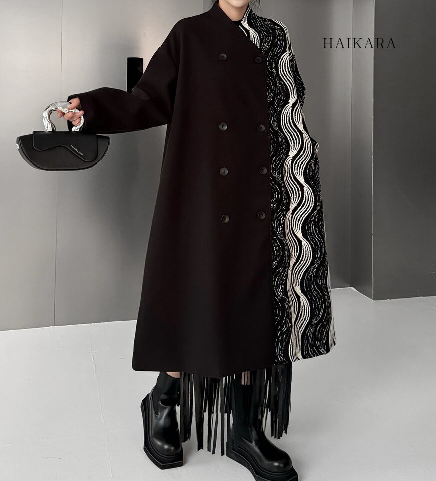 ★【 片側が無地、もう片側が波模様の生地で切り替えられた、ロング丈のコートです。