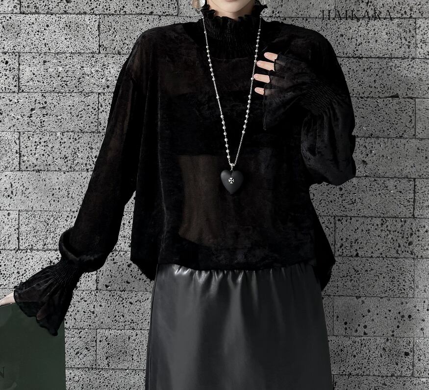 ★【 透け感のあるメッシュ素材にベロアのような加工が施された、ハイネックのトップスです。