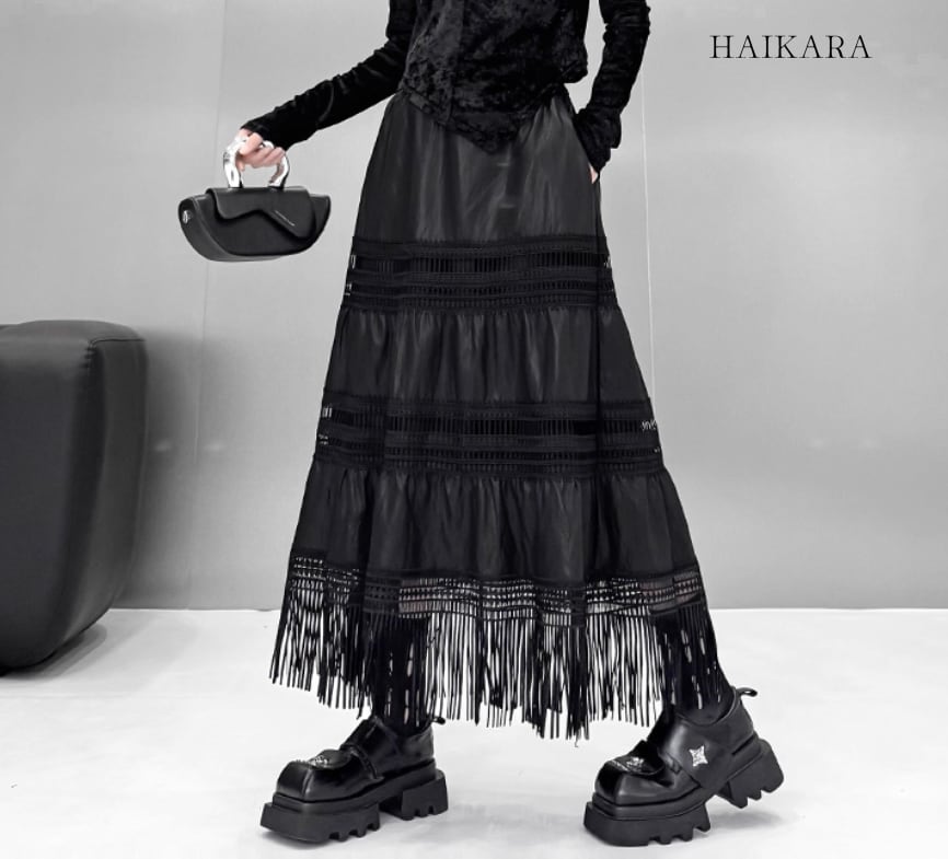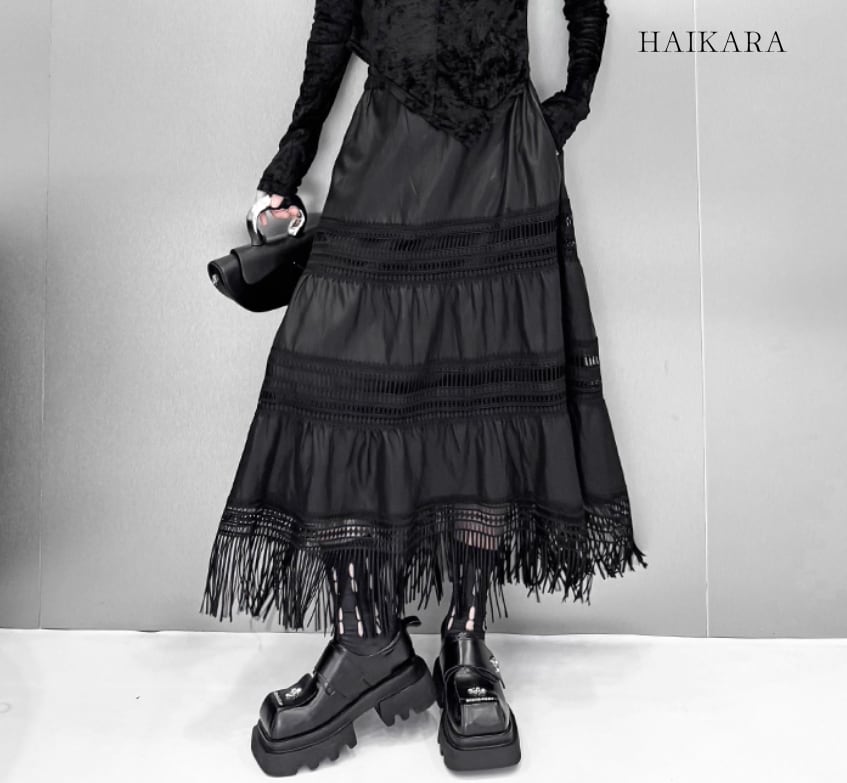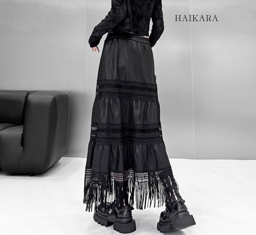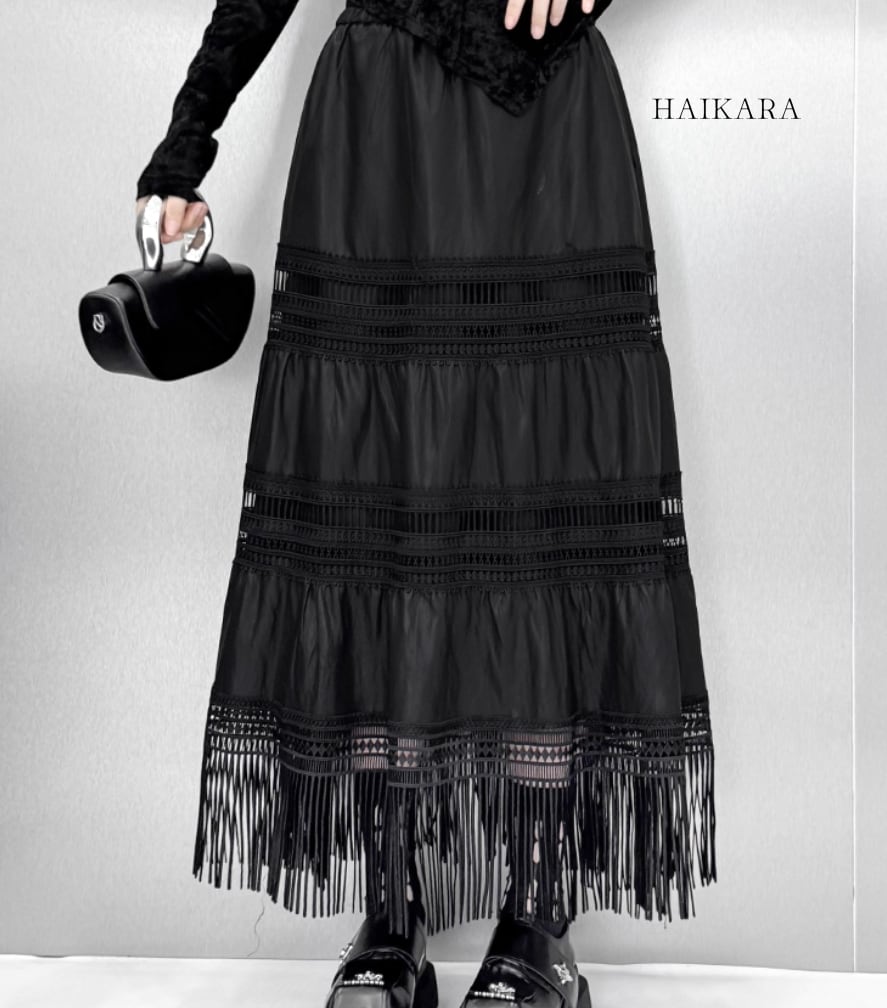 ★【 PU素材とレース調の透かし柄の生地を何段も切り替えた、ロング丈のスカートです。