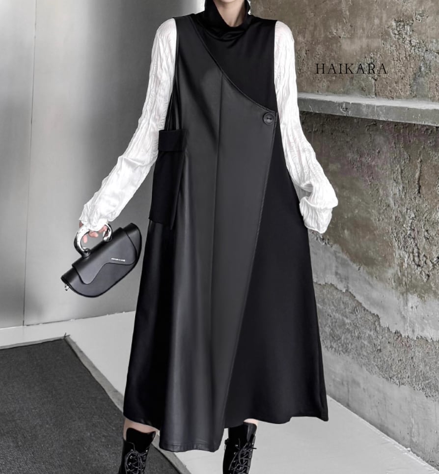 ★【 PU素材を使用した、スタンドカラーのロングノースリーブワンピース(ジレ)です。