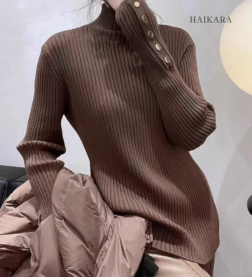 ★【 袖口に連なったゴールドカラーのボタンがアクセントになった、ハイネックのリブニットです。