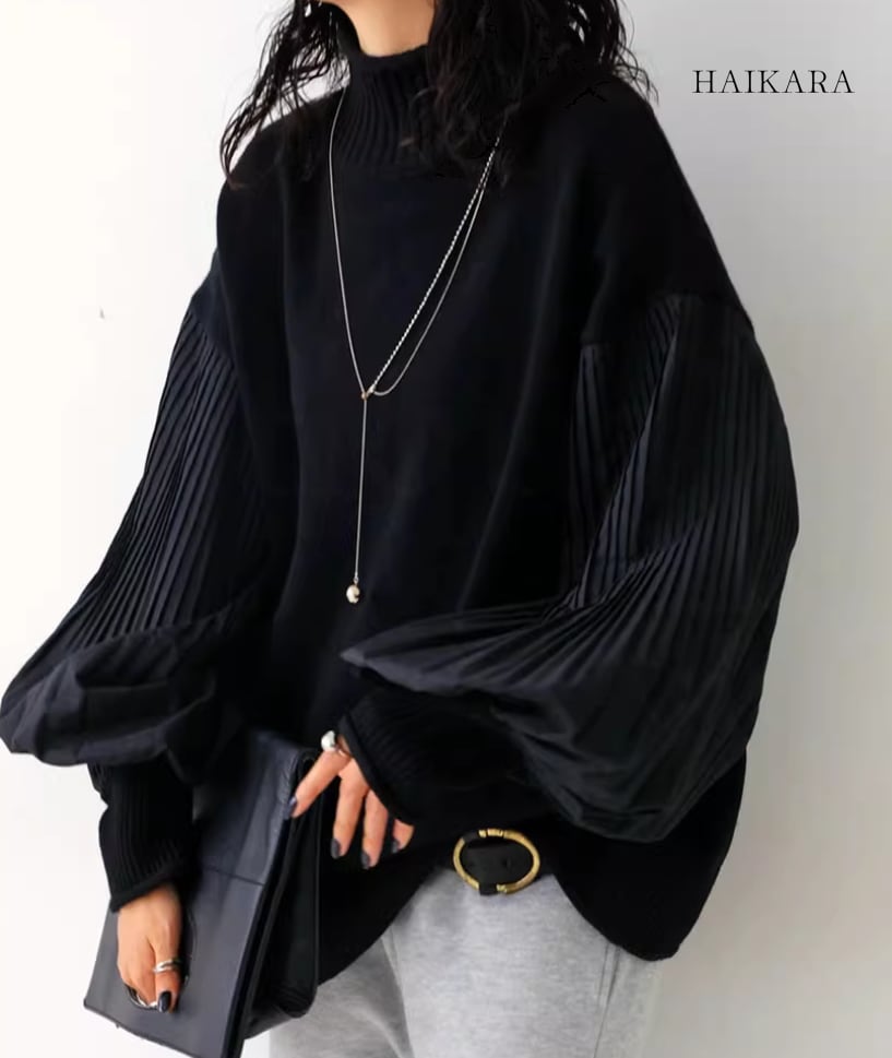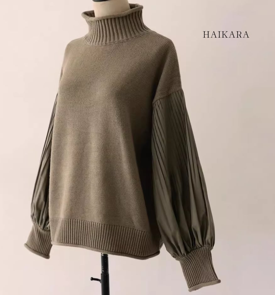 ★【 ニットの身頃にプリーツ加工の異素材の袖を切り替えた、デザイン性の高いタートルネックトップスです。