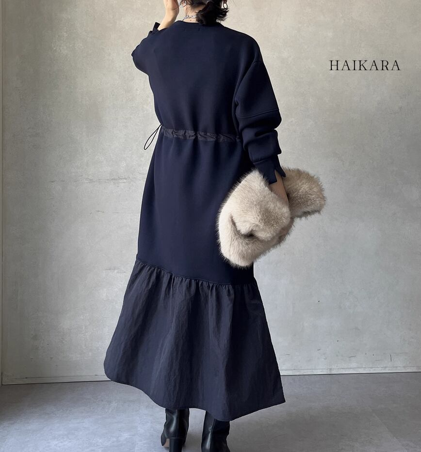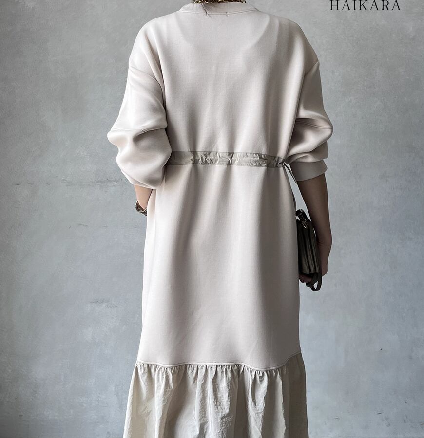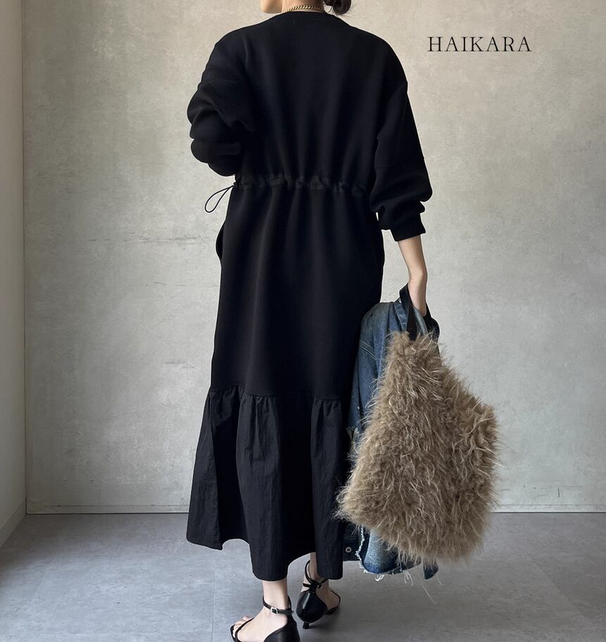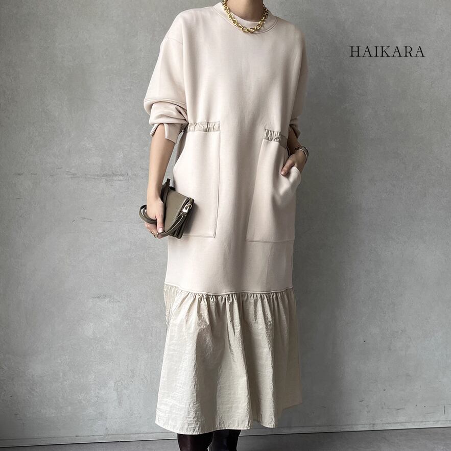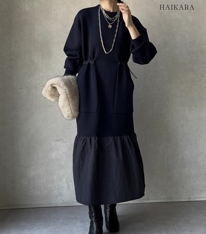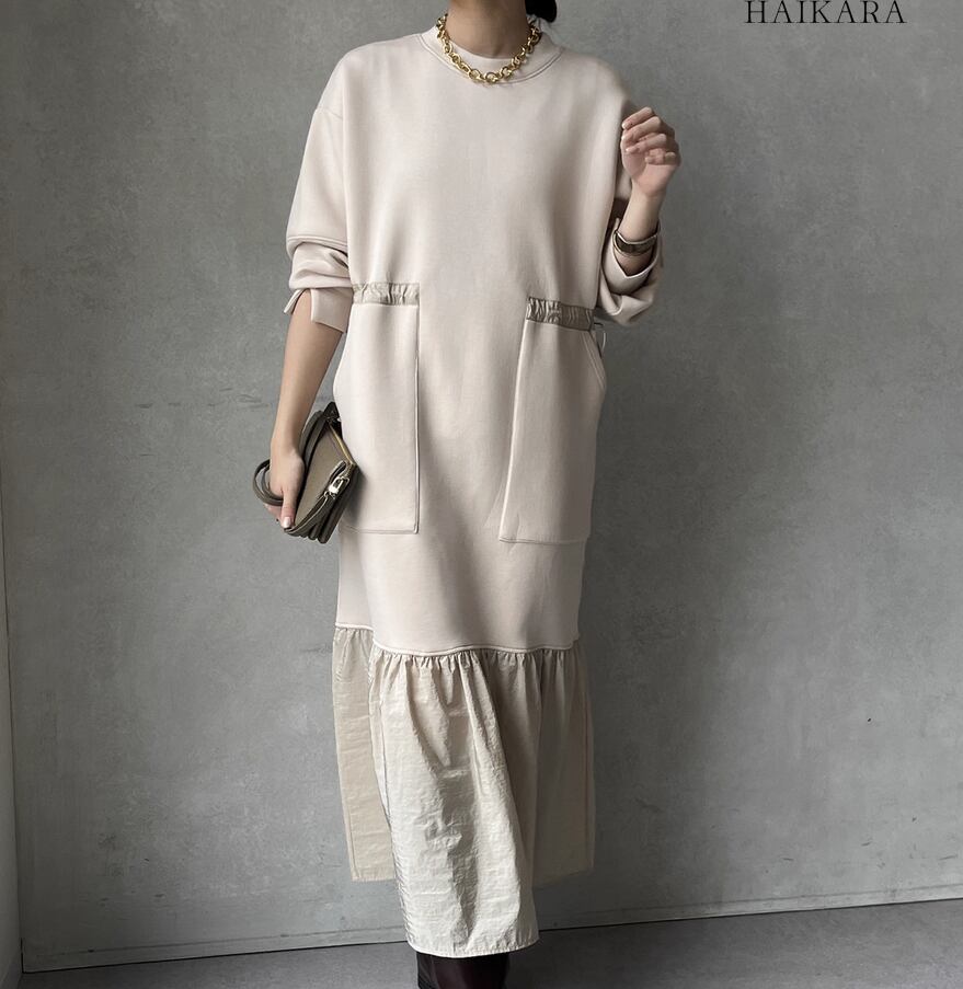 ★【 カジュアルなスウェット生地と、ハリのある異素材のフリルを裾で切り替えたロングワンピースです。