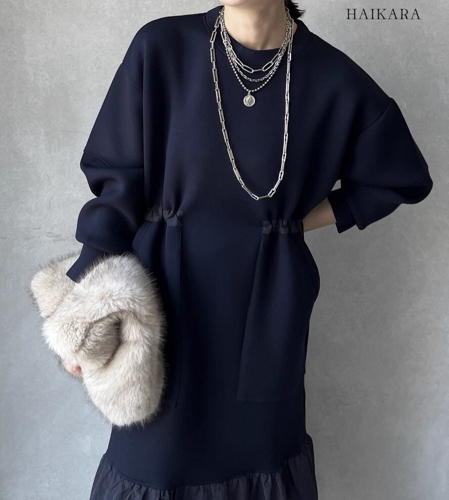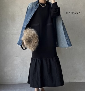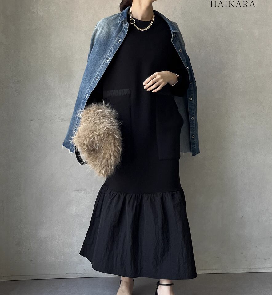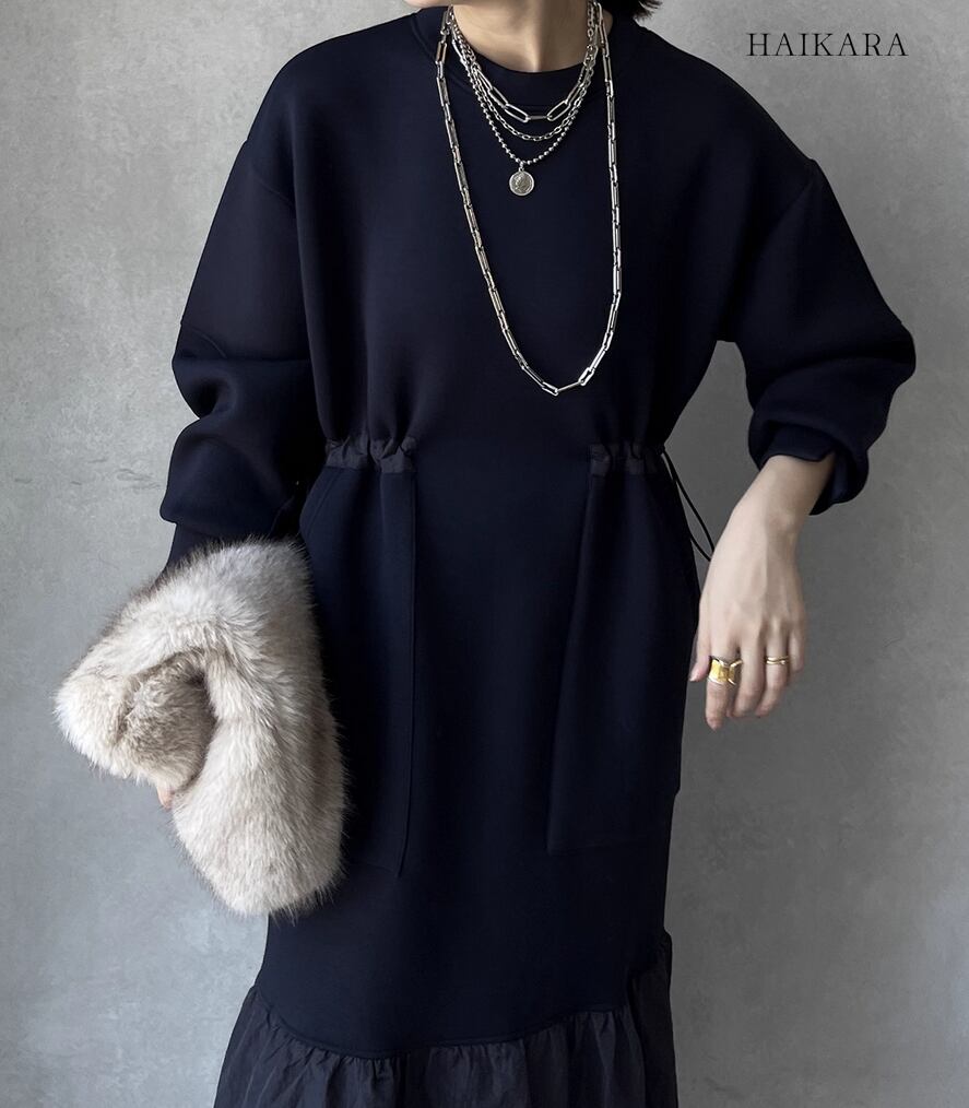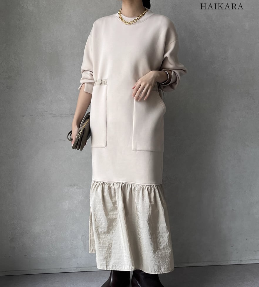 ★【 カジュアルなスウェット生地と、ハリのある異素材のフリルを裾で切り替えたロングワンピースです。